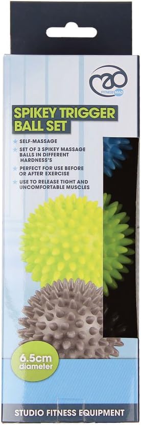 Fitness Mad Spikey Massage Ball, Ideal for Trigger Point Therapy, Deep Tissue & Myofascial Release, Relaxes Tight Muscles & Stress, 3 Hardness Levels (Blue, Green & Grey)